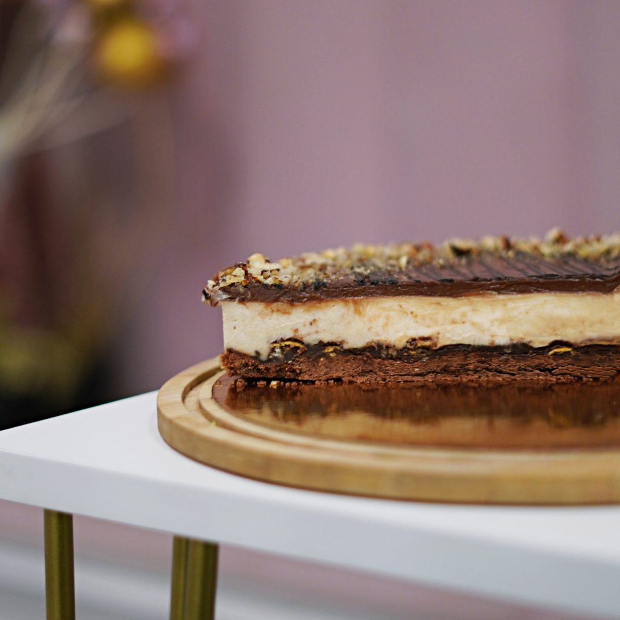 | czekoladowy spód kruchy | chrupka czekoladowa | krem o smaku orzecha laskowego i białej czekolady | nugatowa polewa czekoladowa